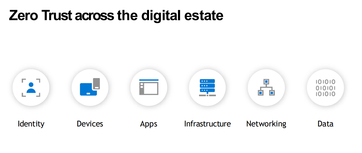 Phương pháp tiếp cận Zero Trust nên mở rộng trong toàn bộ lĩnh vực kỹ thuật số và đóng vai trò như một phương thức bảo mật tích hợp và chiến lược end-to-end. Điều này được thực hiện bằng cách triển khai các công nghệ và kiểm soát Zero Trust trên sáu yếu tố nền tảng: identities, devices, applications, data, infrastructure và networks. Mỗi yếu tố trong số sáu yếu tố nền tảng này là một nguồn tín hiệu (source of signal).