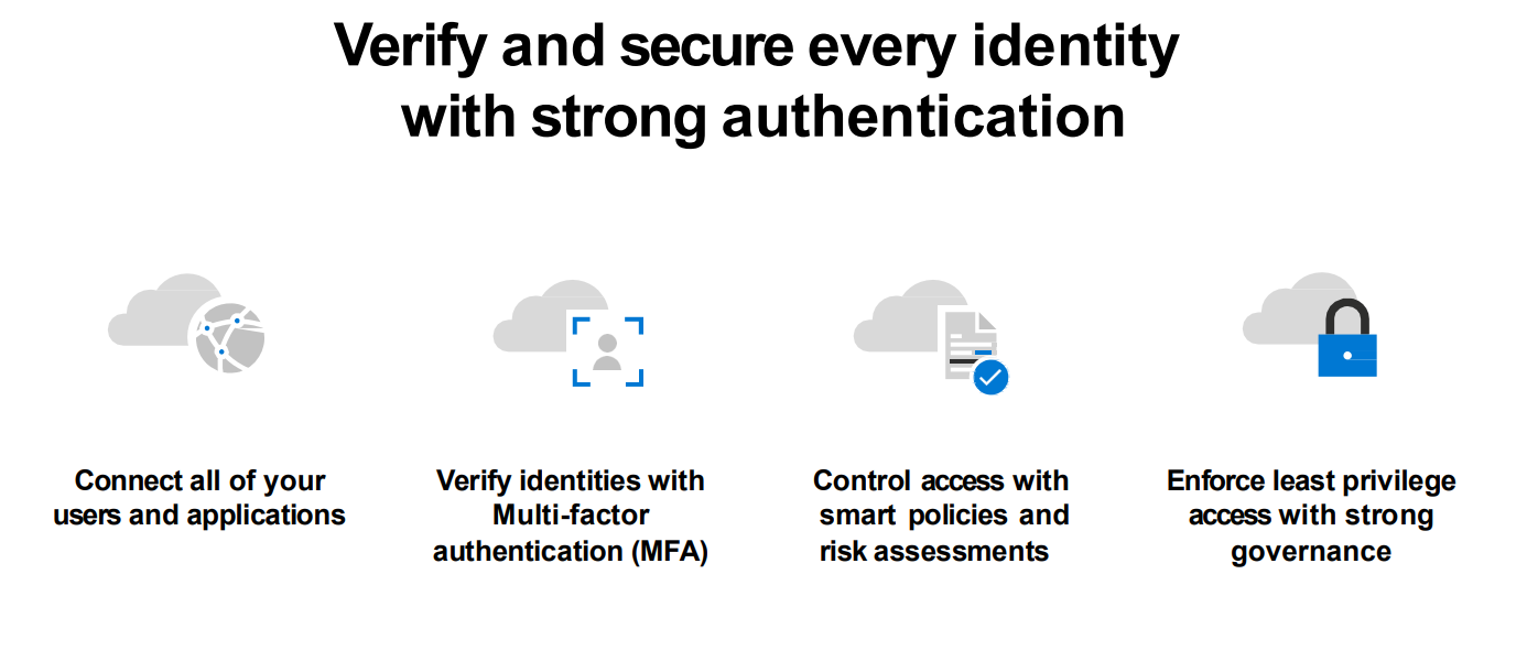 - Xác thực mạnh mẽ/Strong authentication. Đảm bảo xác thực đa yếu tố mạnh mẽ và phát hiện rủi ro phiên làm xương sống trong chiến lược truy cập để giảm thiểu nguy cơ xâm phạm identities.